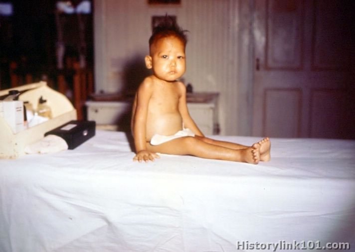 Native Guam being cared for by US Navy doctor at civilian hospital in Agans. Child with Beri-Beri being examined by Lt.