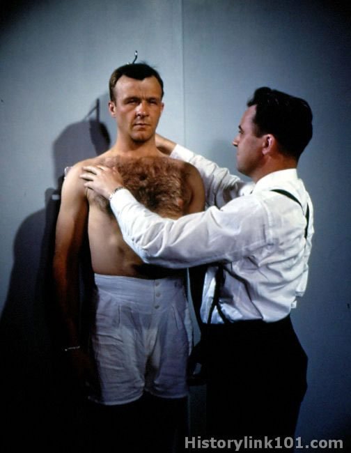 Diving candidates are shown in various phases of training. Taking standard height and weight measurements.