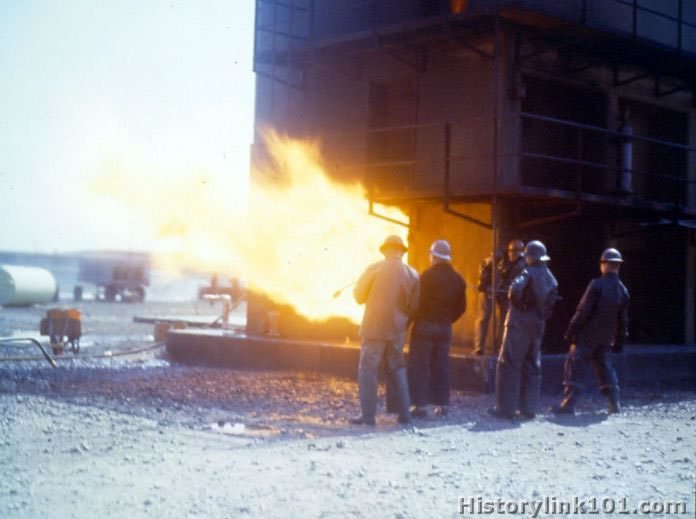 Student fire fighters receive realistic training in extinguishing fires at fire fighter school.