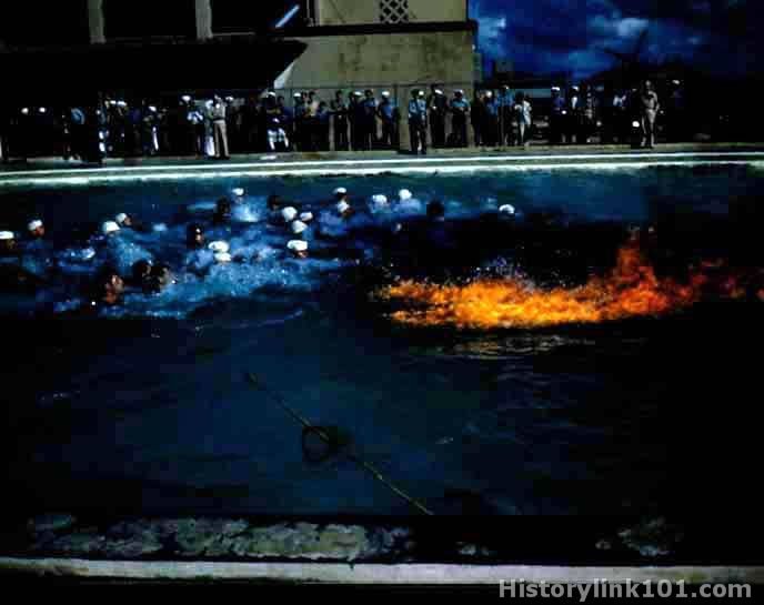 Red Cross combatant swimming tests are held at Naval Base pool. Swimming fully clothed through flames.