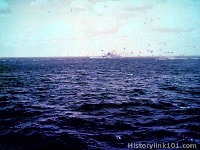 Jap "Kamikazi" attack on Essex Class carrier and on Task Force; taken from the USS Wisconsin. March 18, 1945