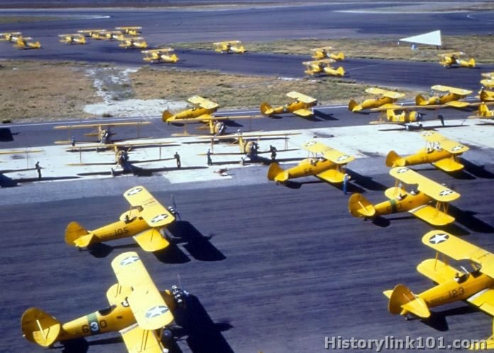 N3N's are seen from hangar at primary flight training school for aviation cadets.