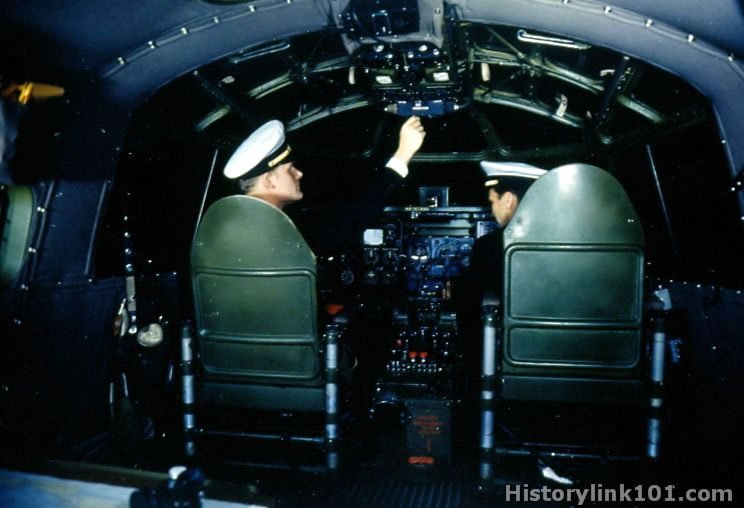 Planes and activities of the Naval Air Transportation Service. This view of the PB2Y-3R control compartment shows the posts of the captain and the first officer. January 1943