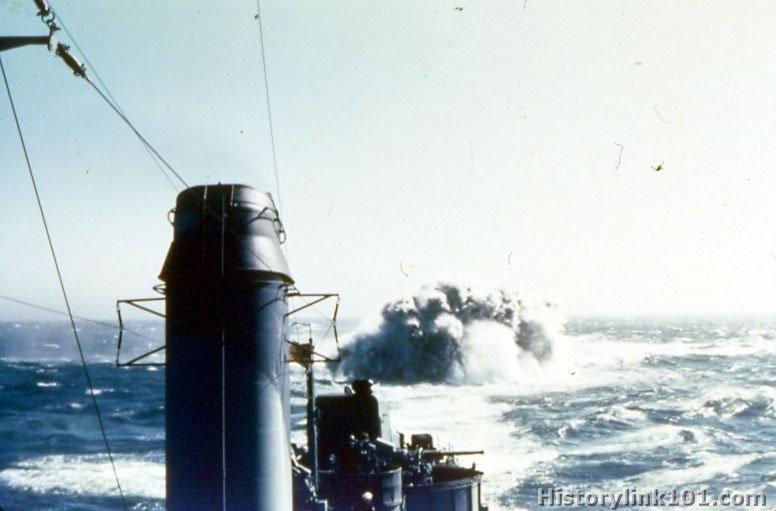 Tons of briny deep gurgle into a frothy mass astern a destroyer as a depth charge finds its depth and explodes. Dec. 18, 1945