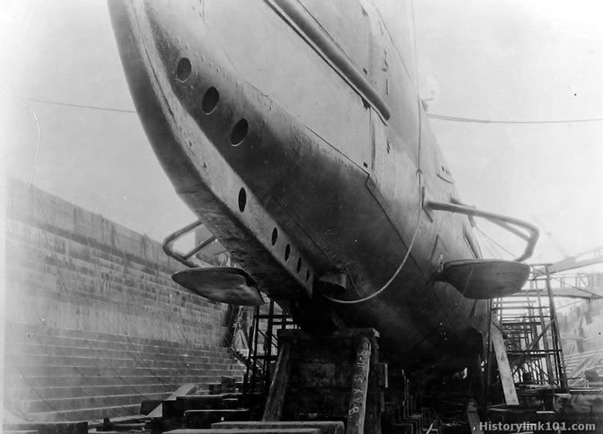 NY Portsmouth, NH Submarine "S-49" bow view showing bow diving planes in normal position. Dec. 1923