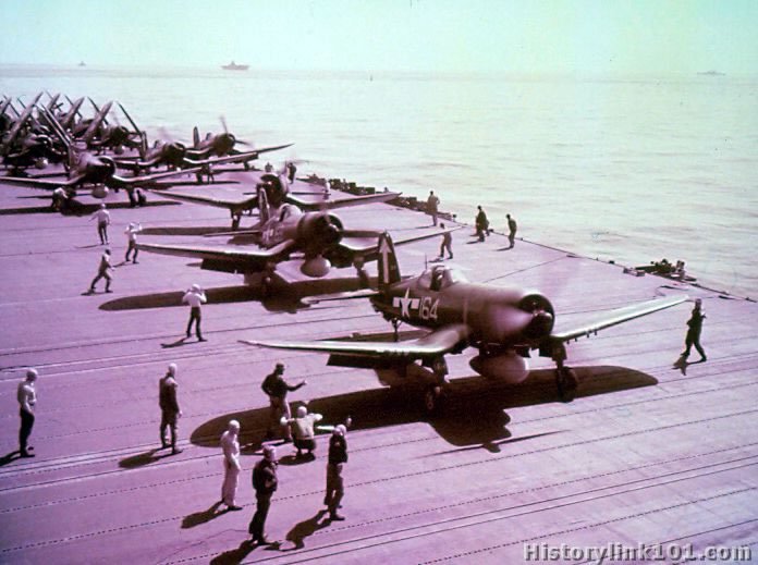 Chance Vought "Corsairs" F4U on deck of the USS Bunker Hill. May 4, 1945