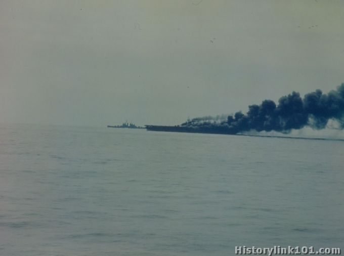 USS Bunker Hill as seen from the flight deck of the USS Randolph just after being hit by two Jap suicide planes.