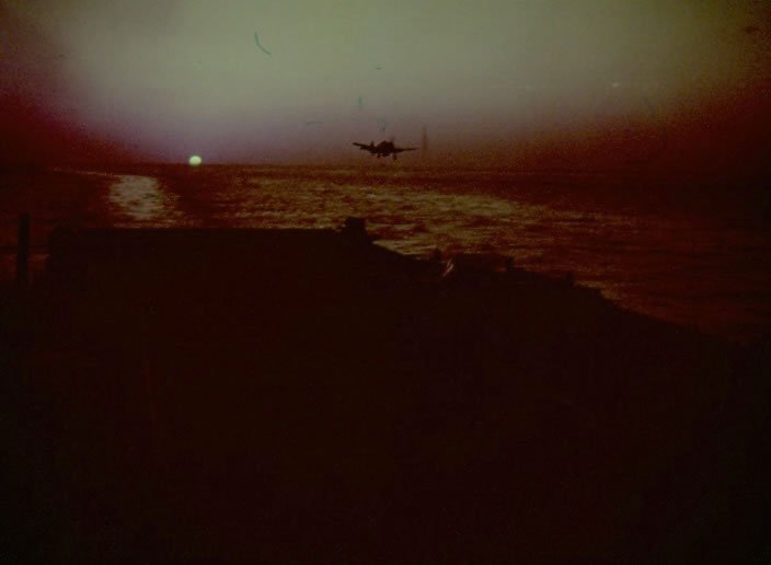 Planes landing aboard USS Hornet at sunset. April 12, 1945