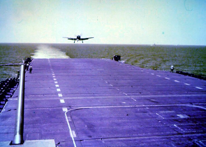 F6F coming in to land on deck of USS Hornet. April 12, 1945