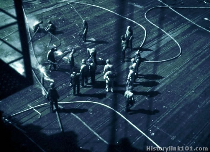 Attack on the USS Intrepid by Japanese suicide planes. Fighting fire on flight deck after two Japanese planes had crashed six month apart. November 25, 1945