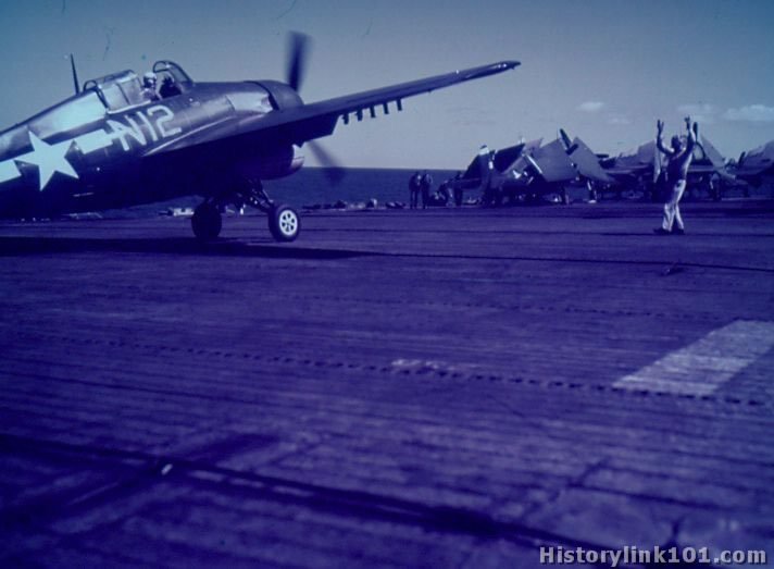 FM-2 "Wildcat" on deck of USS Makin Island. Taxiing forward. Feb. 14, 1945