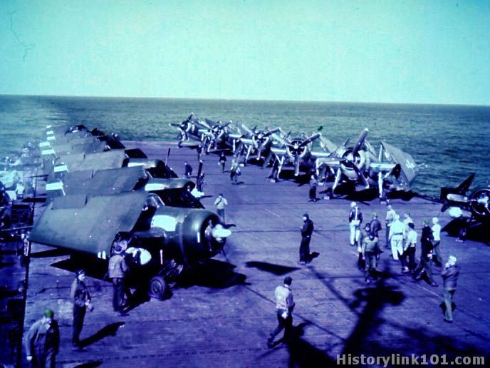 Planes spotted on deck of USS Makin Island during Iwo Jima operations.