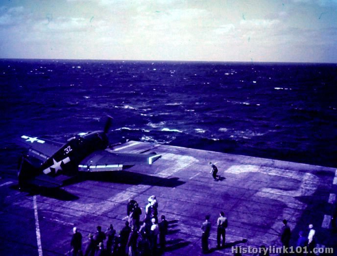 TBM landing on USS Makin Island during Iwo Jima operations.