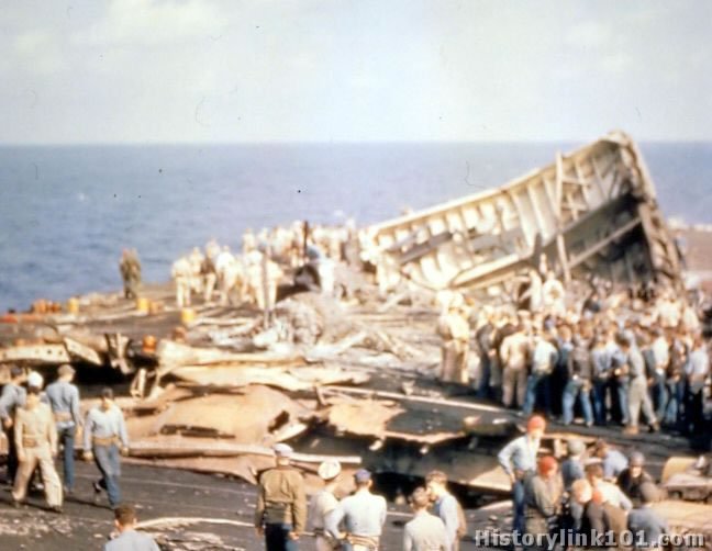 Flight deck of the USS Sangamon damaged by a Jap plane. May 5, 1945