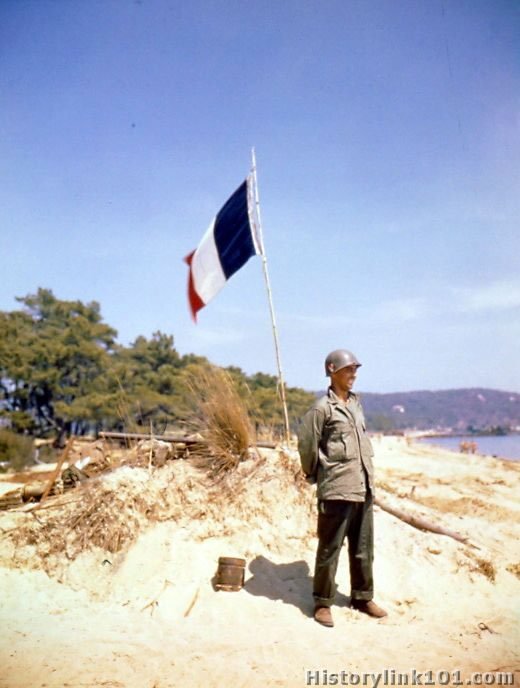 A beach battalion soldier watches landing craft head beachward, as behind him flies the flag of France. August 18, 1944