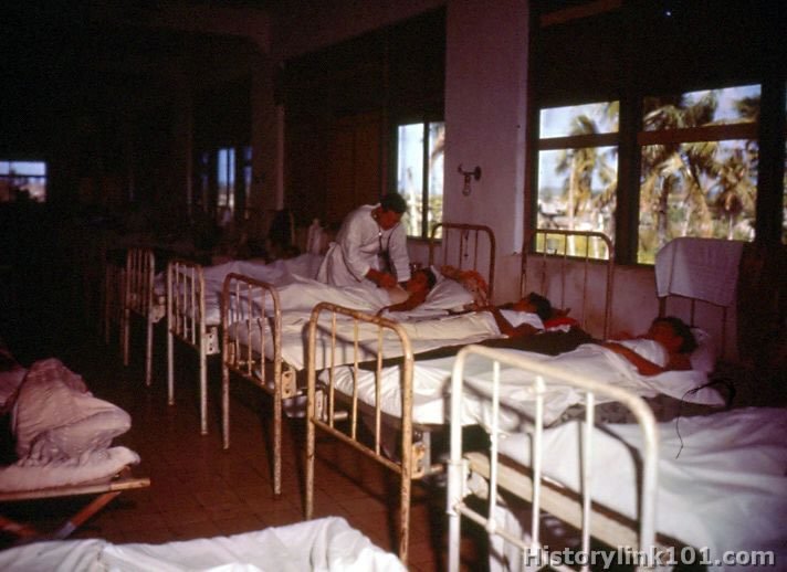 Native Guam being cared for by US Navy doctor at civilian hospital in Agans, Guam.