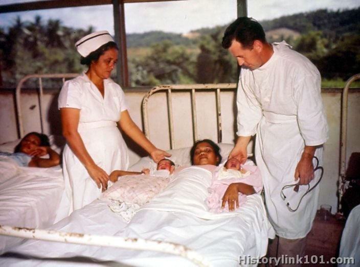Native Guam being cared for by US Navy doctor at civilian hospital in Agans, Guam. Mother with newly-born twins receiving care from Lt.