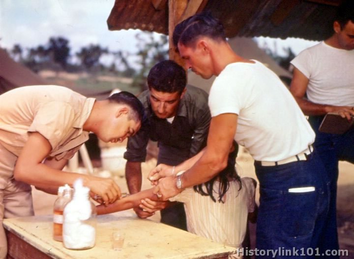 Chamorro children in village of Sinajana, Guam being innoculuated by Pharmacists.
