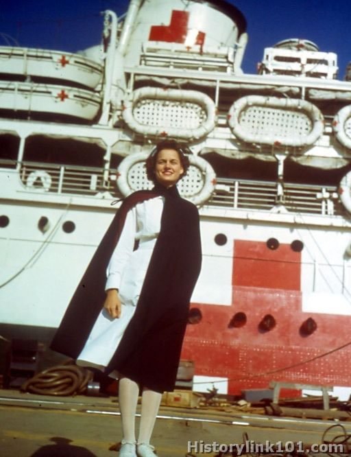 Ens. Mary Jane Alred, USN, stands on dock beside army hospital ship.