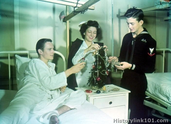 Ens. Audrey E. Etie, USN, Navy Nurse, help decorate Christmas tree for survivor of the USS Rich sunk off French Coast.
