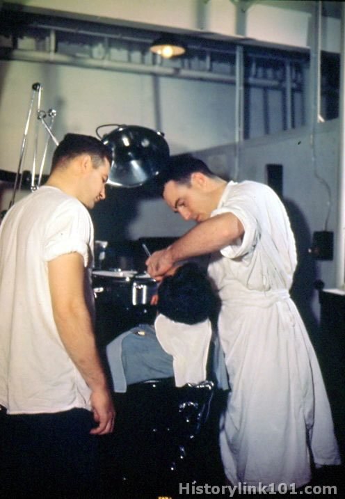 Dental office and laboratory on board the USS Randolph. Checking patients teeths. May 26, 1945