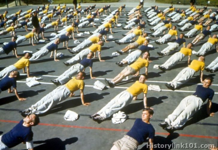 Aviation cadets do calesthentics as part of physical training program at pre-flight school, Del Monte, CA. Workout is held in tennis court of former Del Monte Hotel.