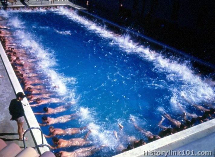 Activities at pre-flight school, St. Mary's, CA. Aviation cadets practice kicking in swimming classes. Feb. 1943