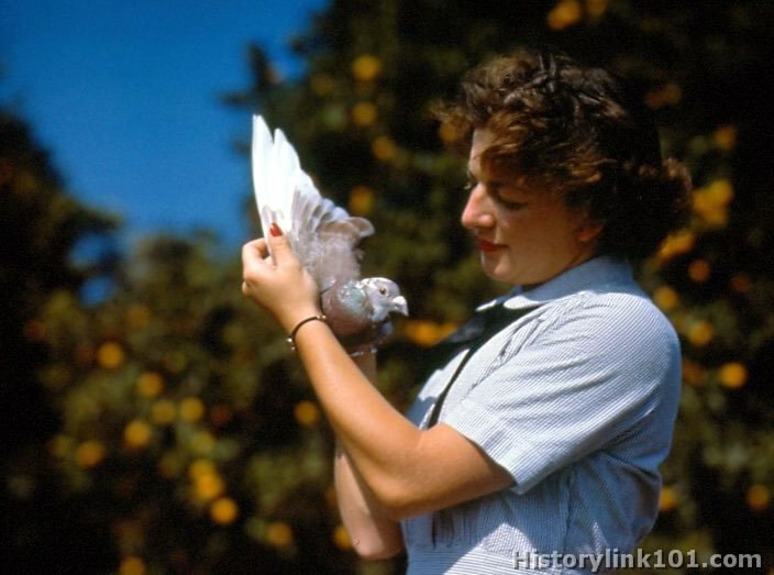 WAVE at the NAS Santa Ana, CA gently holds one of the 200 carrier pigeons. The pigeons are used to transmit communications from the air to the station when radio silence is being maintained.