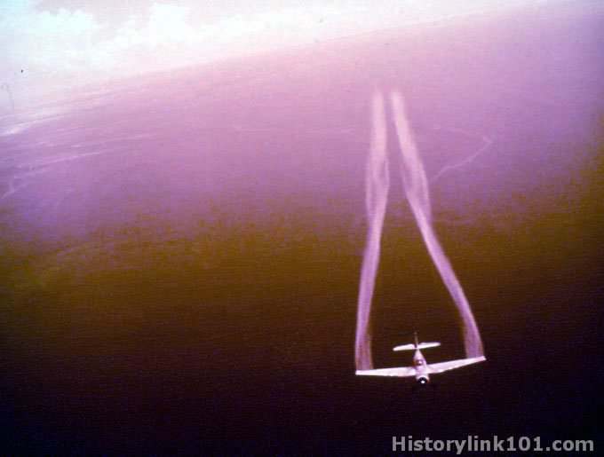 Malaria Control plane, spraying. Spray can be seen against sky and water. Guadalcanal