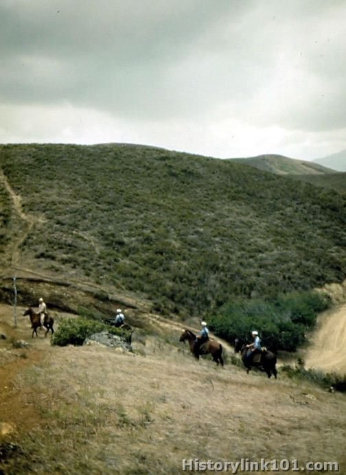 Sailors on horseback pack way up to lookout post on New Caledonia.