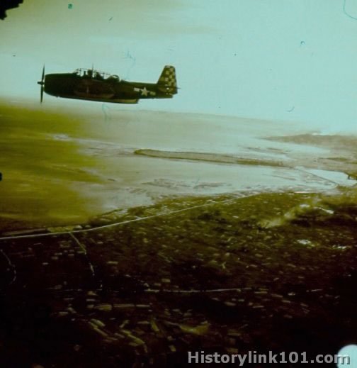 "Avenger" over colored patchwork quilt-like terrain of Okinawa, during landing operations. April 1, 1945
