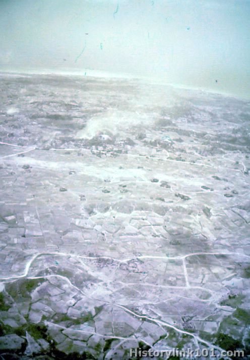 Aerial of airfield at Okinawa, Ryukyus. As seen from plane USS Hornet. April 18, 1945