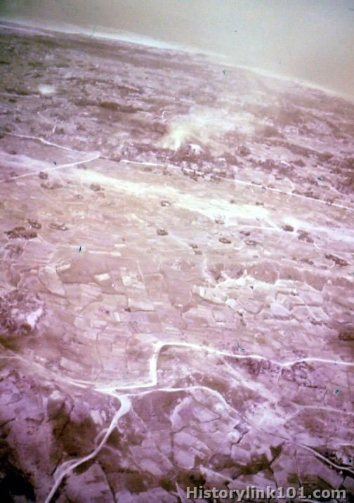 Aerial of airfield at Okinawa, Ryukyus. As seen from plane USS Hornet. April 18, 1945