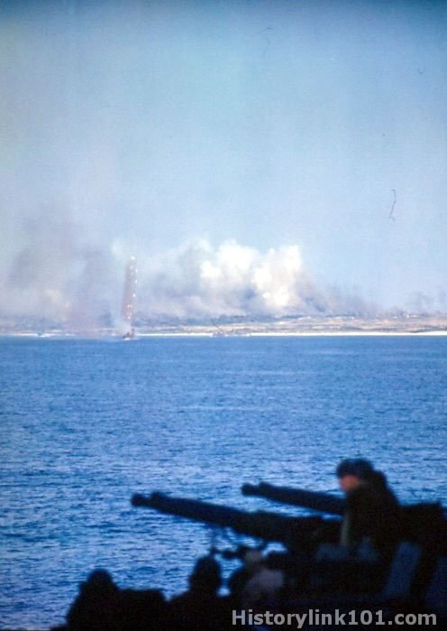 Invasion of Ie Shima just off Okinawa in the Ryukyus, taken by the USS West Virginia. Gosuki Mountain in background. April 16, 1945