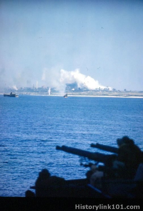 Invasion of Ie Shima just off Okinawa in the Ryukyus, taken by the USS West Virginia. Gosuki Mountain in background. April 16, 1945