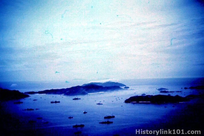 Kerama Retto, Ryukyu Island; showing Seaplane Base in upper center of photo. At left are Aka Shima and Yakan Shima Island with Kume Shima in the distance at right can be seen Amuri Jima and Zamami Jima Island with Tonschi Jima in the distance. May 3, 1945.