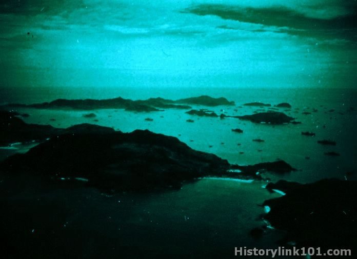 Kerama Retto, Ryukyu Island: looking NNE across Aka Shima; seaplane base; Zamami Jima upper left; and Amuro Jima showing Ships Repair Base upper right. May 31, 1945