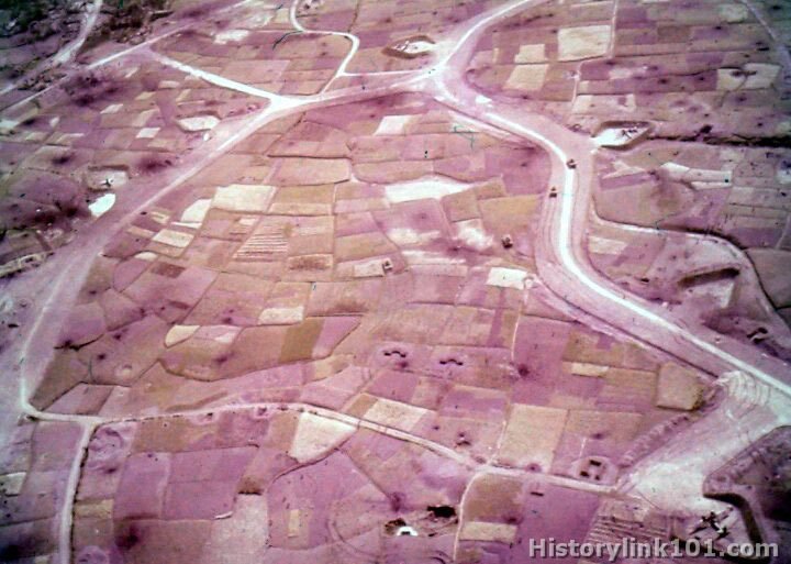 Love day landings on Okinawa showing Yantam airstrip with Army tanks in possession of field. Taken from USS Makin Island. April 1, 1945