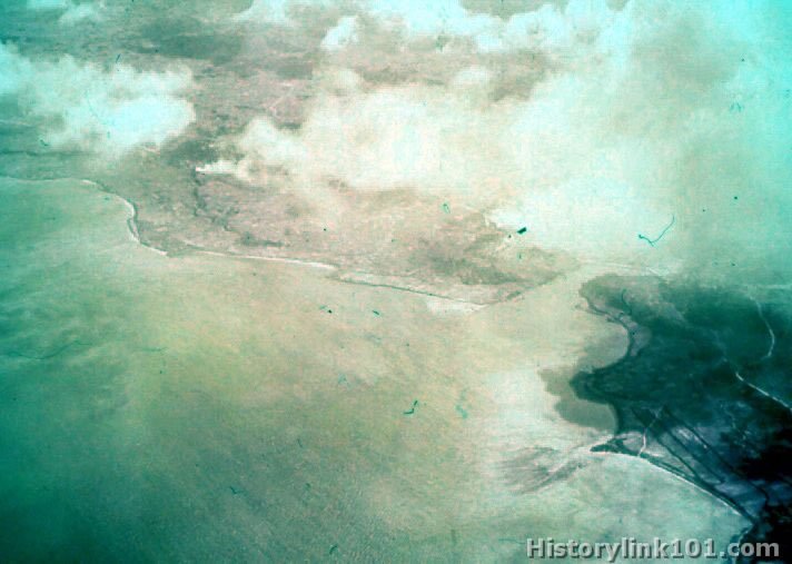 Love day landings on Okinawa showing Yantam airstrip with Army tanks in possession of field. Taken from USS Makin Island. April 1, 1945
