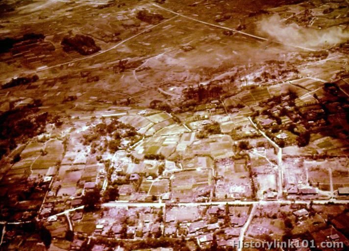 Aerial of Okinawa as seen from plane from USS Hornet. April 1945