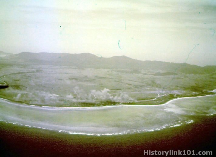Bombs from planes of an escort carrier of the Pacific Fleet fall on Mijara Airfield on Ishigaki near Formoea in the Ryukyus. June 7, 1945