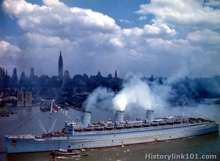 USS Queen Mary returning to New York with US troops from Europe. June 20, 1945