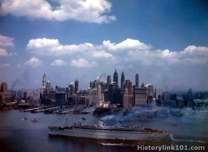 USS Queen Mary returning to New York with US troops from Europe. June 20, 1945
