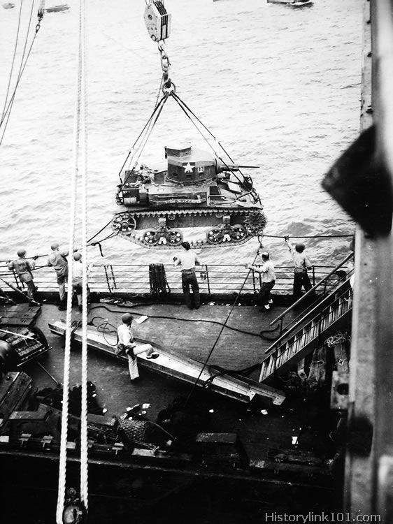 A Marine Cops tank, nicknamed "The Blizzard" is lowered by the side of a ship to a barge for a trip to Guadalcanal, Solomon Islands.