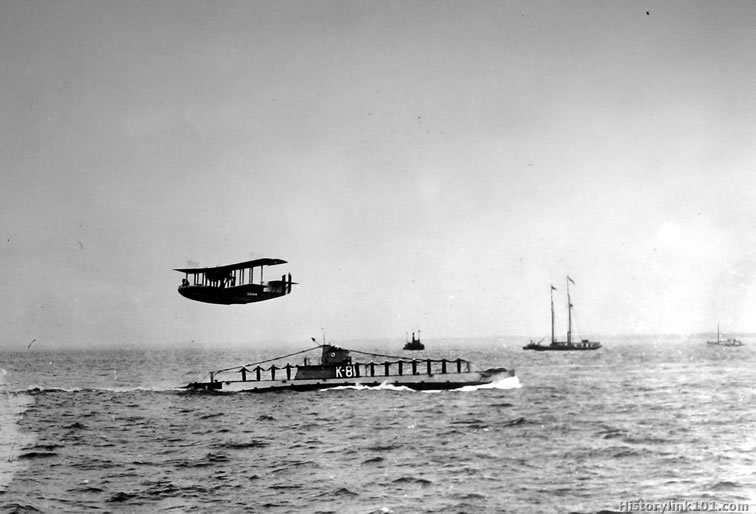 USS K-8 Other vessels in distance. Seaplane close overhead.