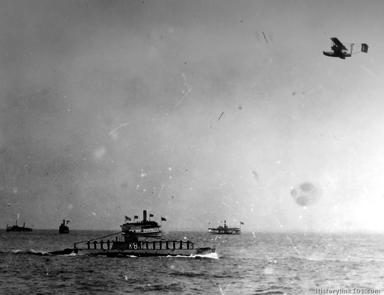 USS K-8 Other vessels in distance. Aircraft overhead broadside.