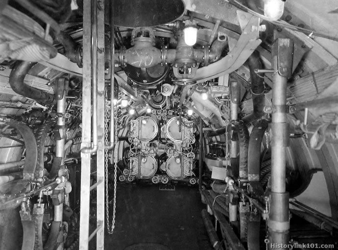 NY Portsmouth, NH Submarine "S-1". Torpedo room looking forward. Dec. 1922