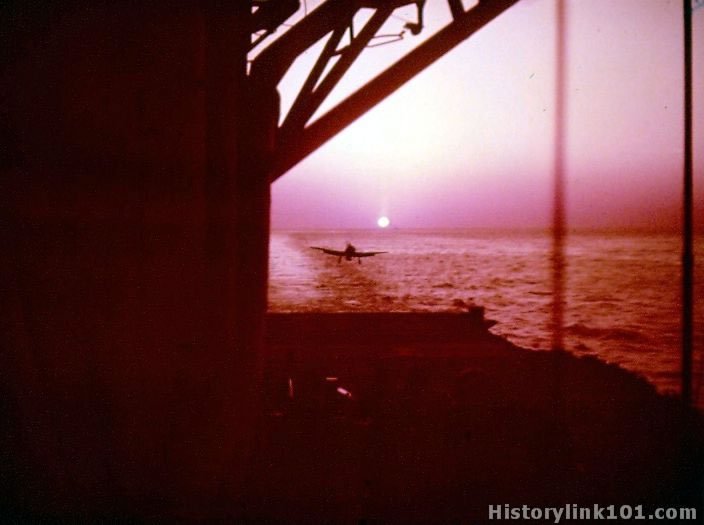 A US Task Force in the Pacific Japan. A TBM as it comes in to land on a carrier at sunset, following a strike on Japan.