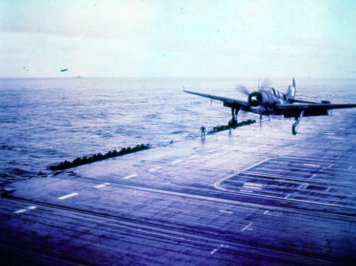 SB2C landing aboard USS Hornet. March 27, 1945