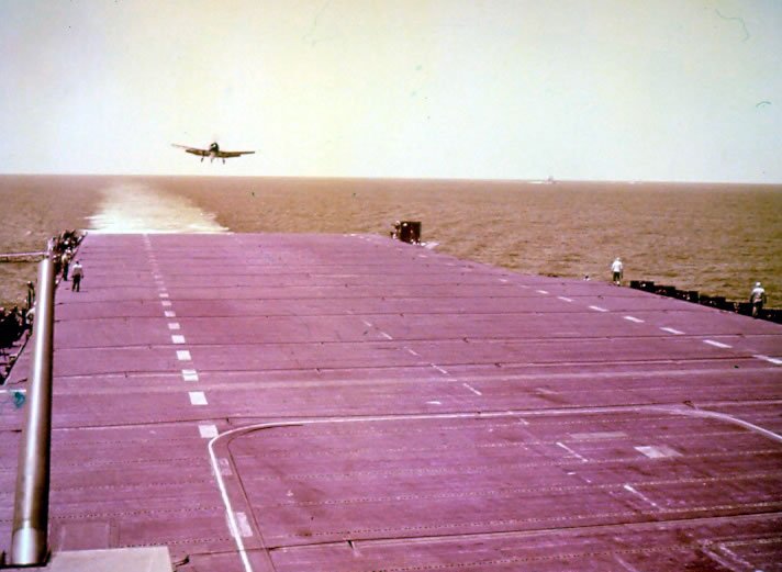 F6F coming in to land on deck of USS Hornet. April 12, 1945